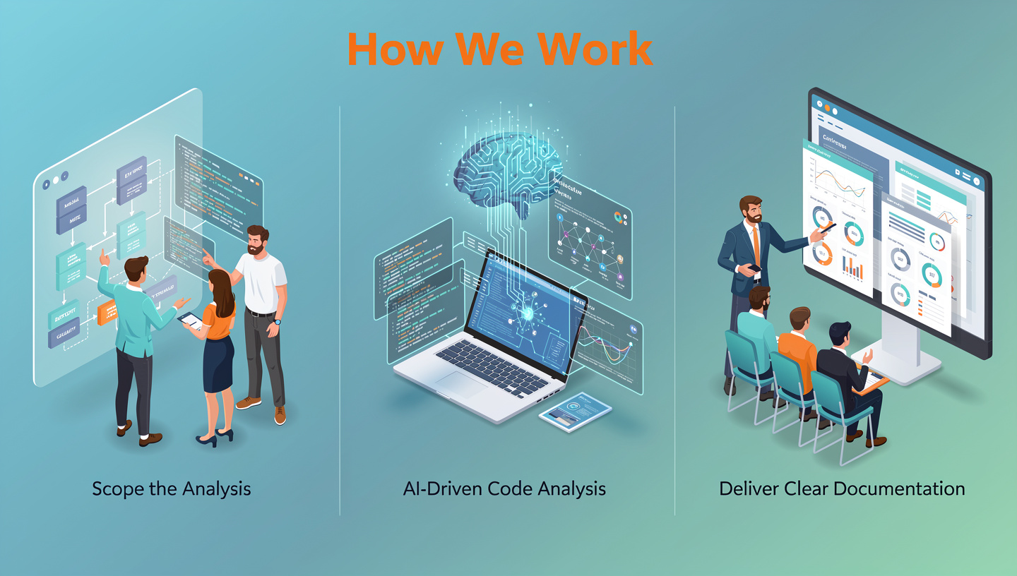 AI-based code analysis allows us to quickly analyze existing code and transform it into clear, structured explanations that business and technical stakeholders can understand.